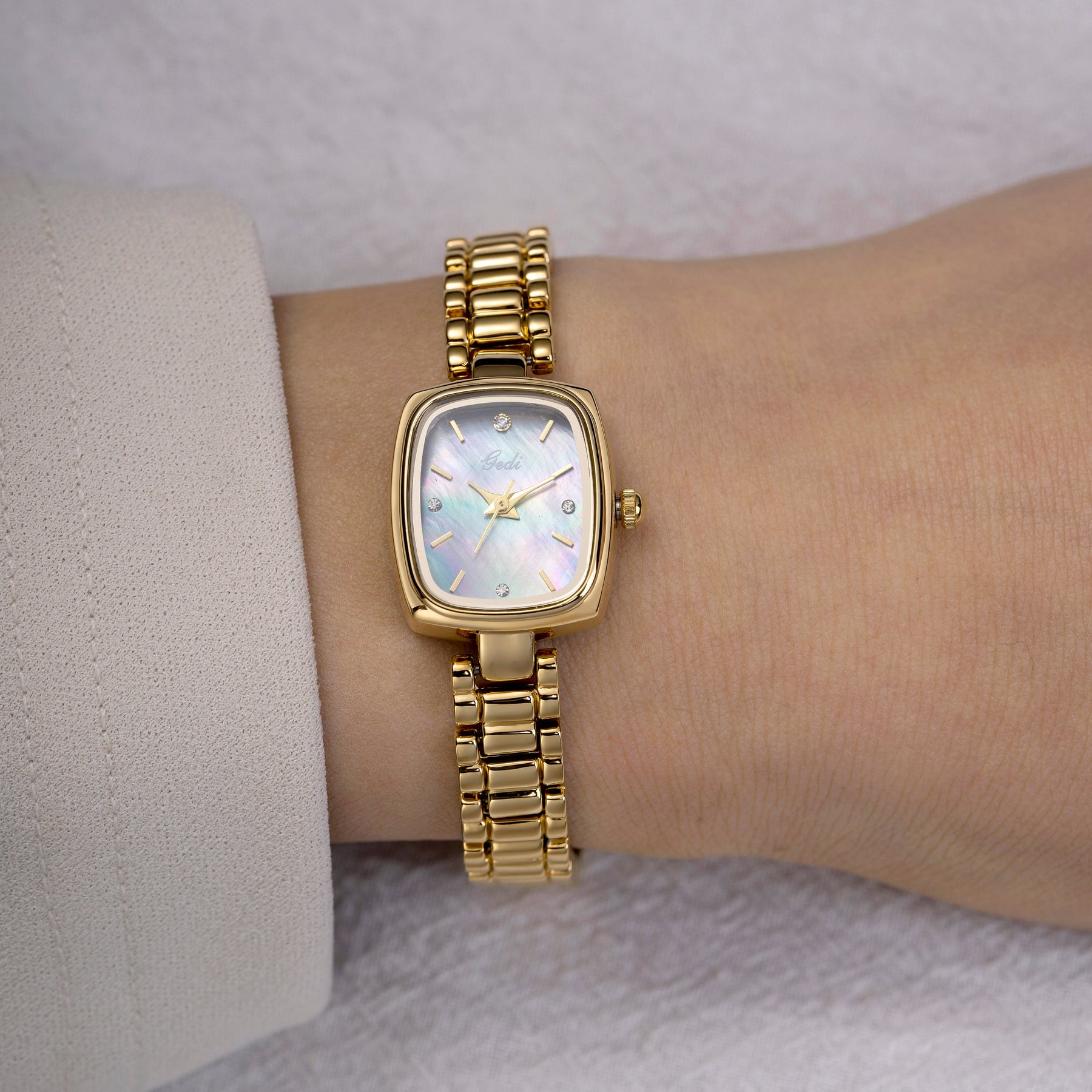 Introducing the Amelia Timepiece — a refined blend of sophistication and classic charm. With its radiant white pearl dial and gold-tone stainless steel bracelet, Amelia is your everyday luxury made to last.